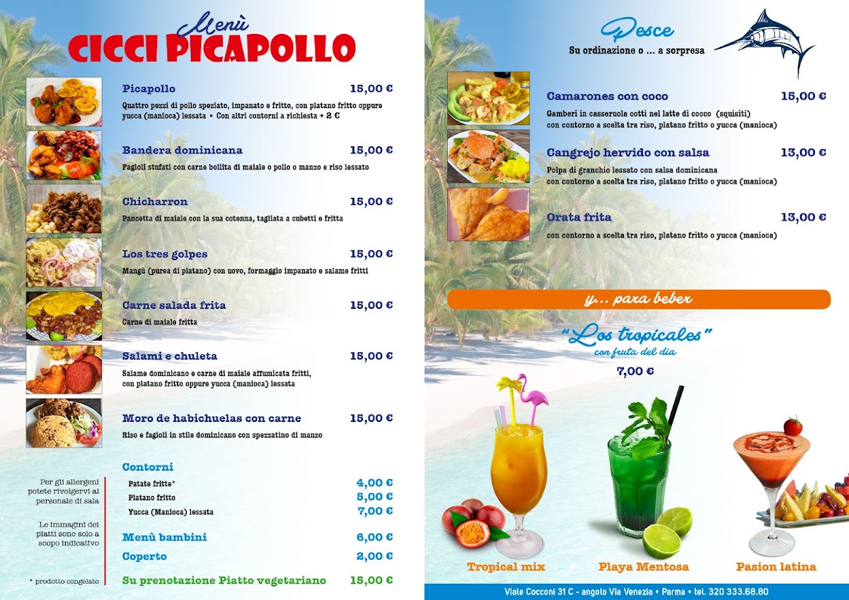 Cicci Picapollo • Cucina Latina offers a vibrant and authentic menu that transports guests to the heart of Latin America. The drink selection is a tropical delight, featuring Pasion Latina, Mama Juana, and Playa Mentosa Tropical Mix, each offering a refreshing and exotic taste. For those looking to indulge in traditional dishes, the Picapollo stands out, bringing a satisfying combination of flavors. The Chicharron con yucca offers a crispy, savory treat, perfectly paired with the delicate sweetness of the yucca. Another highlight is the Los tres golpes, a trio of distinct flavors that captures the essence of Latin cuisine. For seafood lovers, the Camarones con coco is available upon request, bringing together shrimp and coconut for a tropical, flavorful experience. Whether you're in the mood for a hearty dish or a refreshing beverage, Cicci Picapollo promises a memorable culinary experience that celebrates the richness of Latin flavors.